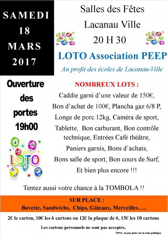 Nombreux lots : Caddie garni d'une valeur de 150€, Bon d'achat de 100€, Longe de porc de 12 kg, Plancha gaz 6/8 personnes, Caméra de sport étanche, Tablette, Perceuse à percussion, Bons d'achat, Bons salle de sport, Bon contrôle technique, Bon carburant 30€, .... Et bien plus encore !!!!