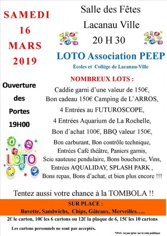 Loto organisé par l'Association PEEP Ecoles et Colléges de Lacanau Ville.