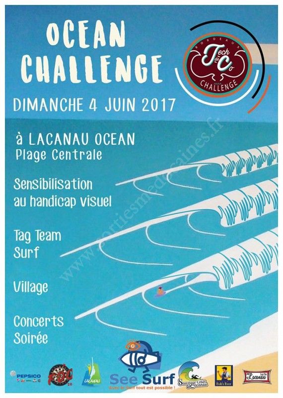 Le 4 Juin 2017, TC Challenge vous présente son tout premier événement, l’Ocean Challenge, en partenariat avec le Lacanau Surf Club - LSC et la mairie de Lacanau. Nous vous convions à la première compétition de surf tagteam les yeux bandés de France dans le but de soutenir l’association See Surf.
