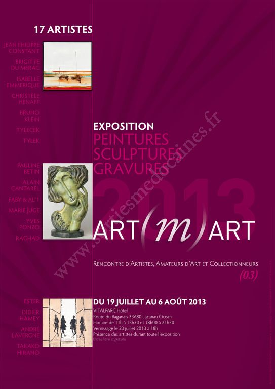 Cette année : 7 peintres, 6 sculpteurs, et 4 graveurs vous sont présentés, aux talents confirmés par de nombreuses expositions : prix et publications. Nous espérions faire découvrir à de nouveaux amateurs et collectionneurs cette large palette de créations, susciter et provoquer des échanges au cours des 2 semaines d'exposition et lors de la soirée de vernissage.