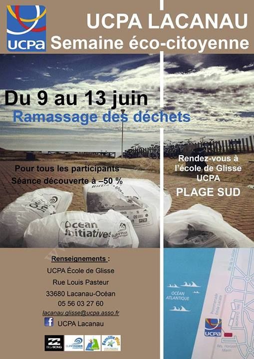 Pour cette semaine et pour la deuxième année consécutive, l'UCPA Lacanau met en place une grande action « La semaine éco-citoyenne ». Le principe ? Ramasser les déchets sur nos plages, forêts (…) pour lutter contre la pollution aquatique et continentale, cause qui nous tient tant à cœur.