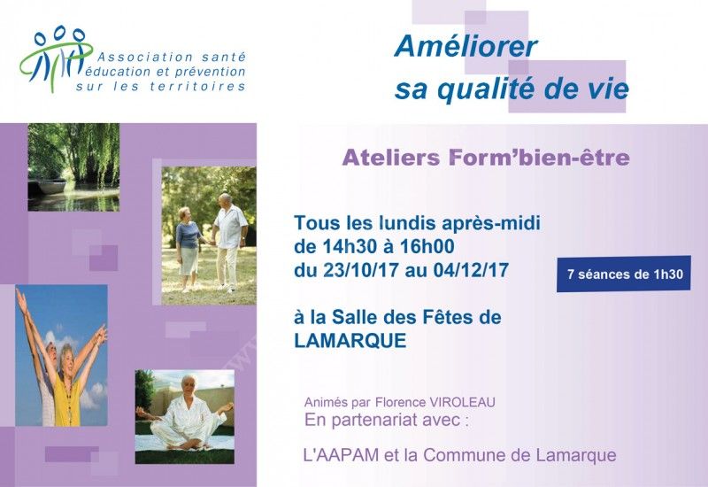 Pour éviter que le mal être ne s’installe et ne conduise à l’isolement et au confinement chez soi, l’Atelier Form’bien-être propose une exploration de son corps, un temps pour redécouvrir des sensations et se recentrer, une palette d’exercices doux et de conseils pour se faire du Bien et développer son potentiel.
