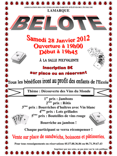 Venez participer à la belote organisée par l'Association des Coccinelles des parents d'élèves de l'école de Lamarque.