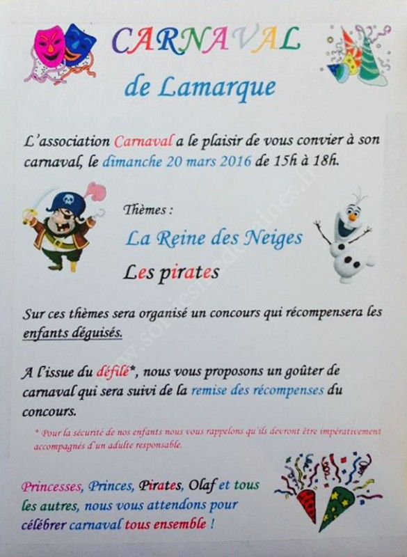 L'association Carnaval a le plaisir de vous convier à son carnaval le dimanche 20 mars 2016.