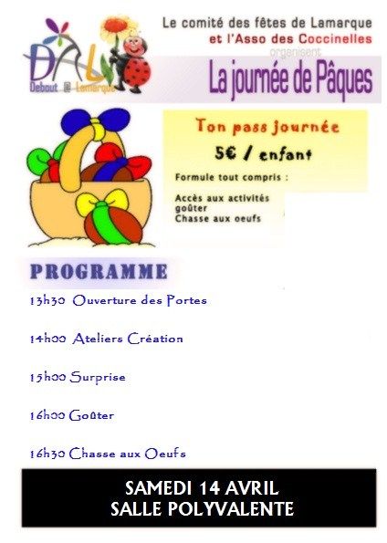 Le comité des fêtes D@L et l'Association des Coccinelles organisent la Journée de Pâques ouvert à tous les enfants de la commune et des communes avoisinantes!!