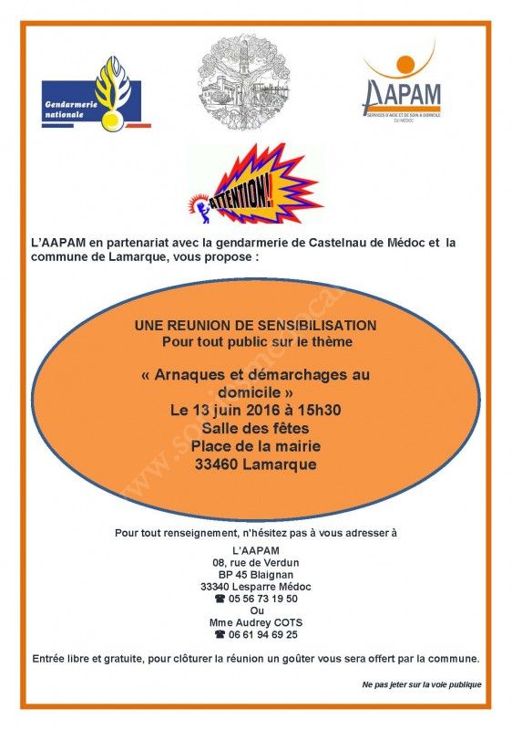 L’AAPAM en partenariat avec la gendarmerie de Castelnau de Médoc et la commune de Lamarque, vous propose : Une réunion de Sensibilisation sur le thème : "Arnaques et démarchages au domicile".