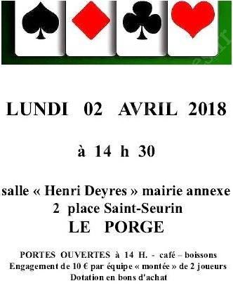 L’association Club des Genêts d’Or organise un concours de belote le lundi 2 avril 2018 à 14h30, précédé de portes ouvertes à 14h00 où vous seront offerts café et boissons.