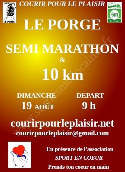 - Par courrier : Courir pour le plaisir - 120 avenue du bassin d'Arcachon - 33680 LE PORGE Règlements à l'ordre de : "Comité de Jumelage Le Porge". AUCUNE INSCRIPTION par téléphone
