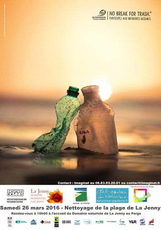 Le samedi 26 mars 2016, à l'occasion de la 21ème édition des Initiatives Océanes organisées par Surfrider Foundation, Imaginat et La Jenny vous invitent, à participer au nettoyage de la plage de La Jenny au Porge en Gironde.