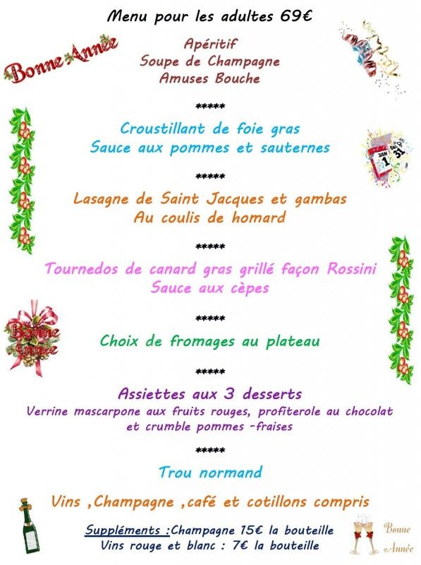 - Suppléments : Champagne 15€ la bouteille, Vin rouge et blanc 7€ la bouteille
