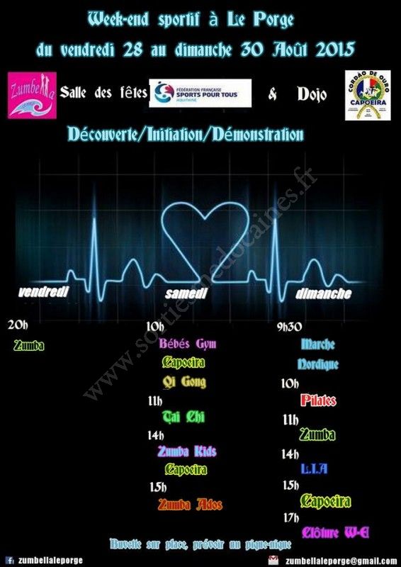 Tout au long du week-end, dans la salle des fêtes ou salle du Dojo, venez découvrir et pratiquer de nombreux sports où le matériel n'est pas nécessaire : zumba, Taï Chi, pilates, capoeira, bébés gym, et bien d'autres!