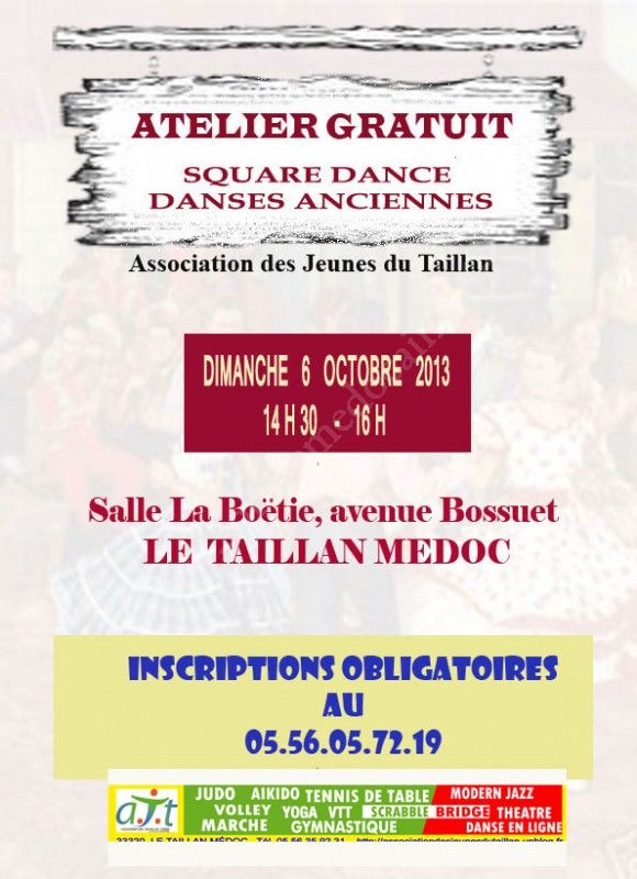 Le COOL DANC' TAILLAN, section de l'AJT propose un atelier gratuit le dimanche 6 novembre de 14 h 30 à 16 h. N'hesitez pas à venir nous rejoindre et participer à ces danses anciennes festives et conviviales. Vous découvrirez le square dance, danses folklorique américaine dans laquelle un groupe de 8 danseurs évoluent en effectuant des figures plus ou moins complexes, dans la bonne humeur. Ouvert à tous, petits et grands, jeunes et moins jeunes.