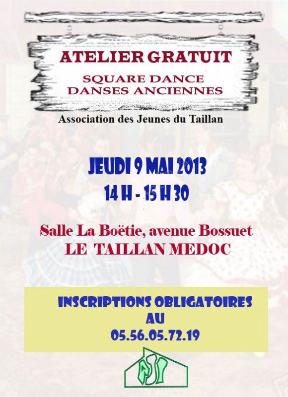 Si vous souhaitez découvrir une autre façon de danser, revenir aur aux sources des danses de nos ancêtres, découvrir le plaisir de danser en groupe, de faire des échanges, dans une ambiance décontractée et rieuse, la section DANSE EN LIGNE de l'AJT propose un ATELIER GRATUIT le JEUDI 9 MAI 2013 de 14 H à 15 h 30.