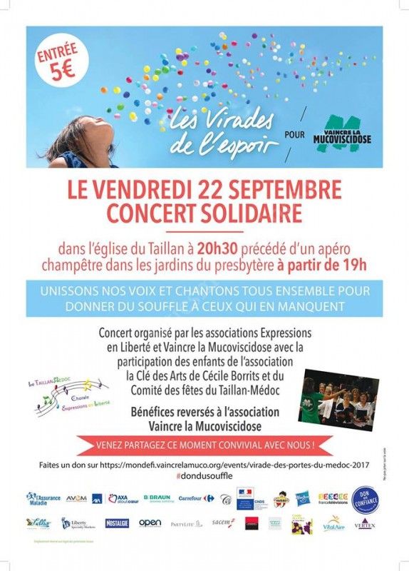Les associations Vaincre la Mucoviscidose et Expressions en Liberté avec la participation: des enfants de l'association la Clé des Arts ainsi que du Comité des Fêtes du Taillan organisent un concert solidaire au profit de la recherche contre la mucoviscidose.
