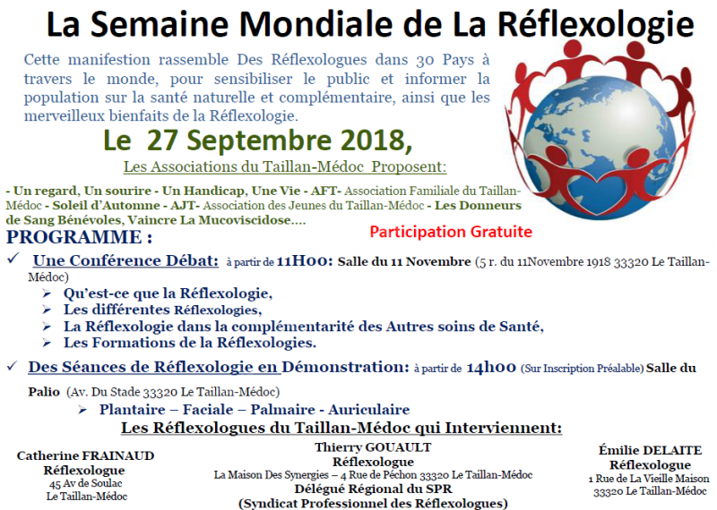 Cette manifestation rassemble des Réflexologues dans 30 pays à travers le monde, pour sensibiliser le public et informer la population sur la santé naturelle et complémentaire, ainsi que les merveilleux bienfaits de la Réflexologie.
