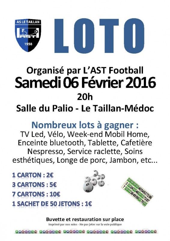 Venez nombreux passer une soirée LOTO en compagnie des bénévoles de l'AST Football, dans un esprit convivial et détendu !