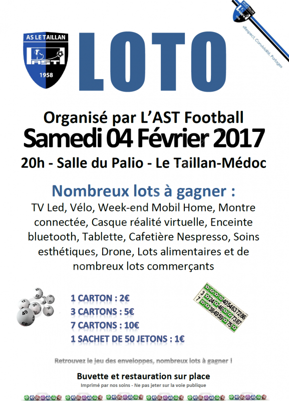 Venez nombreux passer une soirée LOTO en compagnie des bénévoles de l'AST Football, dans un esprit convivial et détendu !