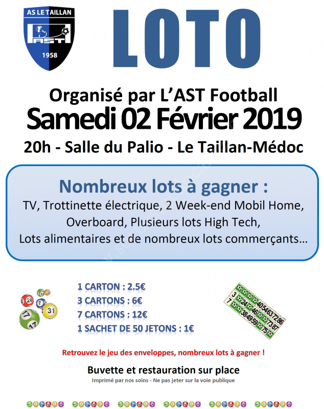 Venez nombreux passer une soirée LOTO en compagnie des bénévoles de l'AST Football, dans un esprit convivial et détendu !