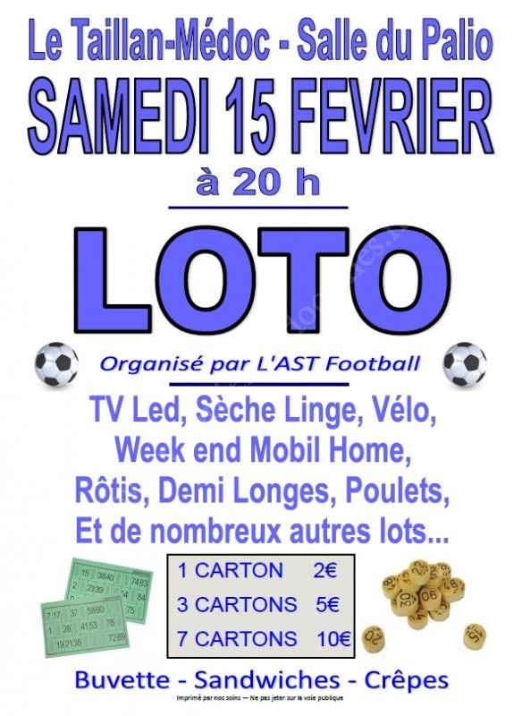 L'Amicale Sportive Taillannaise vous propose de participer à son LOTO annuel qui se déroulera le SAMEDI 15 FÉVRIER à 20H00, à la Salle du Palio située sur le complexe du stade municipal du Taillan-Médoc.
