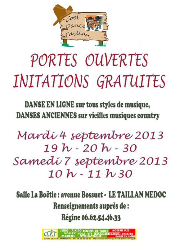 Le COOL DANC' TAILLAN existe déjà depuis 4 ans et propose, avant la reprise de ses activités, des initiations gratuites de DANSE EN LIGNE et de SQUARE DANCE les MARDI 03/09 de 19 h à 21 h 30 et SAMEDI 07/09 de 10 h à 11 h 30 dans la superbe salle La Boëtie, au Taillan Médoc.