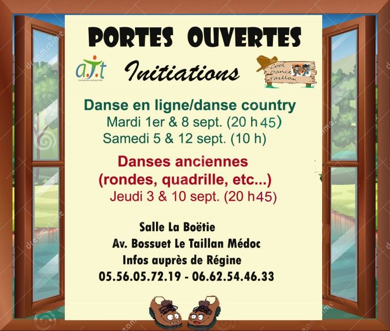 MARDI 1er et 8 septembre (20h45), SAMEDI 5 et 12 septembre (10h00) la section danse en ligne de l'AJT ouvre ses portes pour vous faire découvrir cette forme de danse qui se répand même dans les danses de couple.