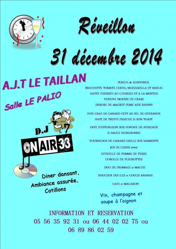 L'Association des jeunes du Taillan (A.J.T) organise comme depuis de nombreuses années le réveillon du 31 décembre 2014. Ce réveillon est animé par le D.J de "ONE AIR 33" et se déroule dans la superbe salle du Palio. Attention : nombre de places limitées à 300