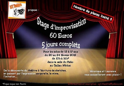 La section théatre de l'AJT propose un stage d'improvisation pour les ados de 12 à 17 ans, dans la salle du Palio pendant les vacances scolaires du 20 au 24 février 2012 (de 10h à 16h).