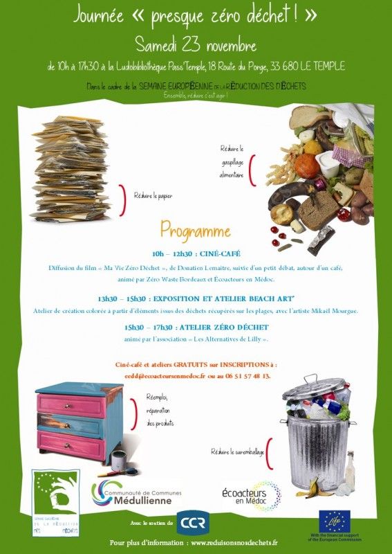 La Communauté de Communes Médullienne, en partenariat avec Écoacteurs en Médoc, vous invite à participer à une journée "presque zéro déchet" dans le cadre de la Semaine Européenne de Réduction des Déchets.