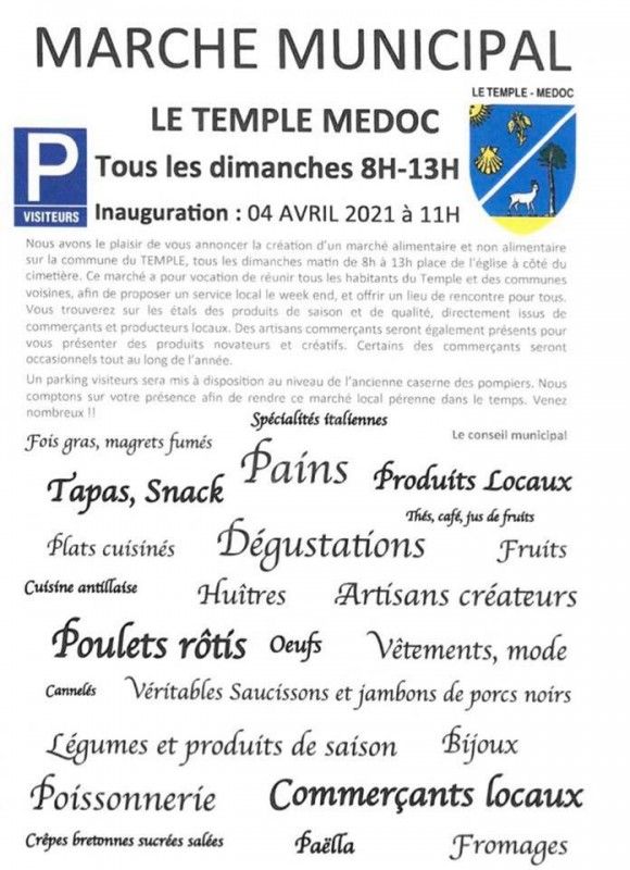 La municipalité a le plaisir de vous annoncer la création d’un marché sur la commune du TEMPLE, tous les dimanches matins de 8h à 13h.