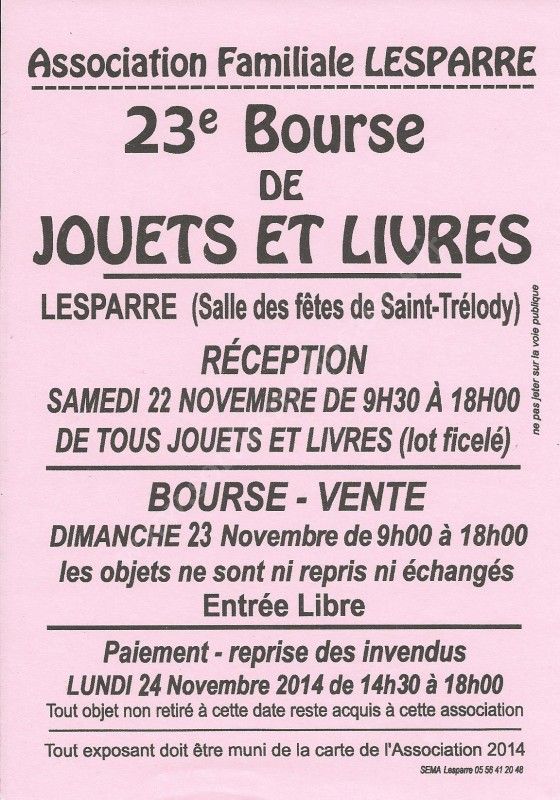 23ème Bourse de Jouets et Livres organisée par l'Association Familiale de Lesparre.
