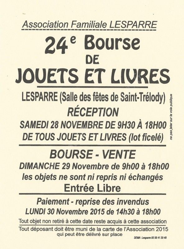 24ème Bourse de Jouets et Livres organisée par l'Association Familiale de Lesparre.