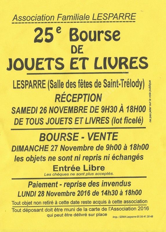 25ème Bourse de Jouets et Livres organisée par l'Association Familiale de Lesparre.