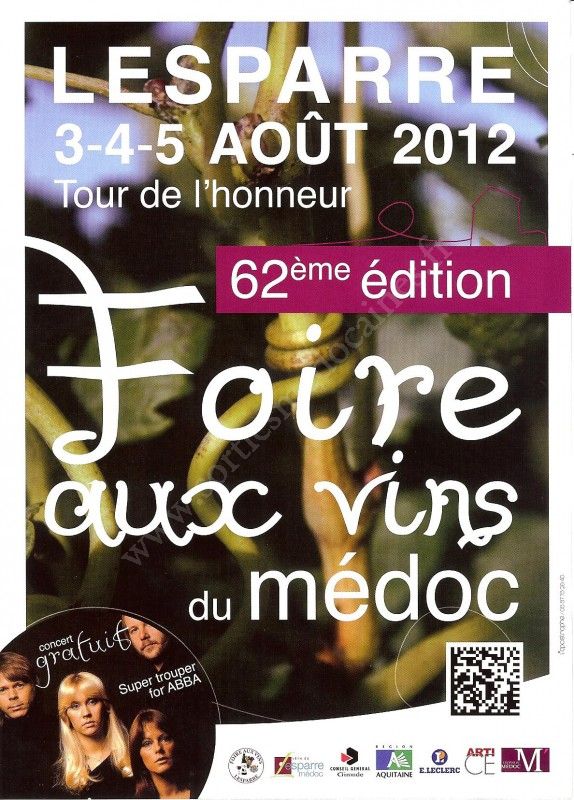 - 17h30 : Inauguration officielle de la 62ème édition de la Foire aux Vins de Lesparre, visite des stands, discours des officiels et intronisations par l'Ordre Médulien, vin d'honneur offert par la Municipalité