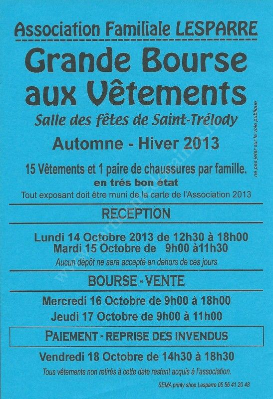 - Bourse-Vente : Mercredi 16 Octobre de 9h00 à 18h00 et Jeudi 17 Octobre de 9h00 à 11h00