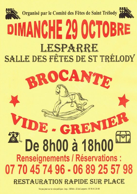 Le Comité des Fêtes de Saint Trélody organise comme chaque Année sa Brocante Vide Greniers d'Automne.