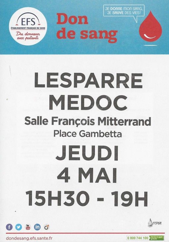 Venez donner votre sang le 4 mai 2017 à Lesparre, vous sauverez ainsi des vies !