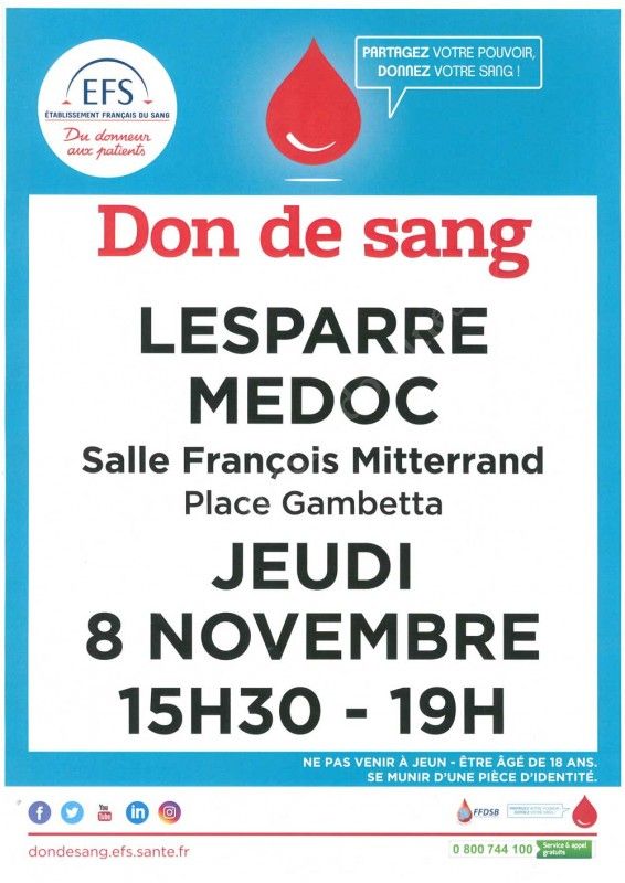 Venez donner votre sang le Jeudi 8 novembre 2018 à Lesparre, vous sauverez ainsi des vies !
