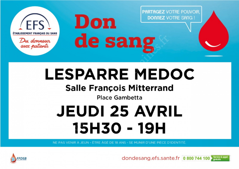Venez donner votre sang le jeudi 25 avril 2019 à Lesparre, vous sauverez ainsi des vies !