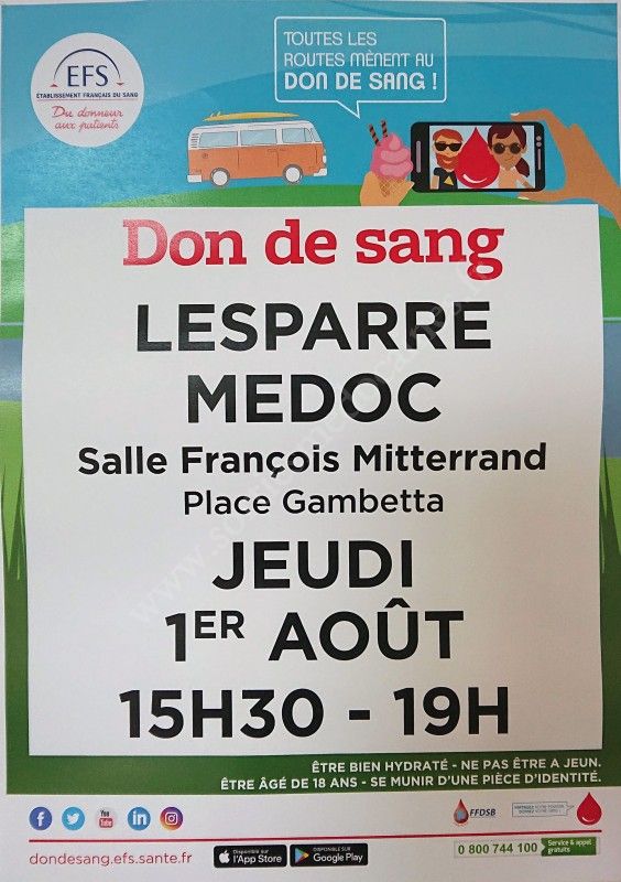 Venez donner votre sang le jeudi 1er août 2019 à Lesparre, vous sauverez ainsi des vies !