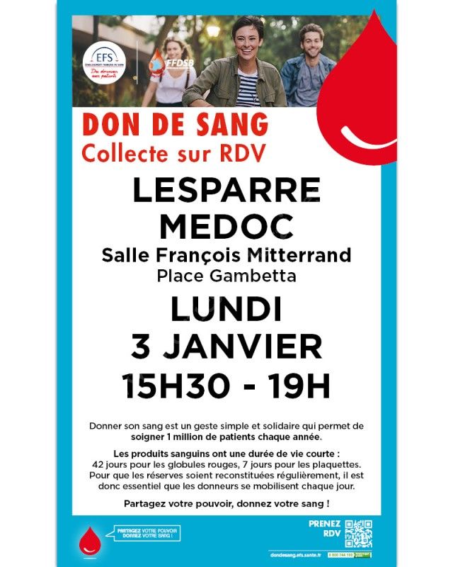 Venez donner votre sang le lundi 3 janvier 2022 à Lesparre, vous sauverez ainsi des vies !