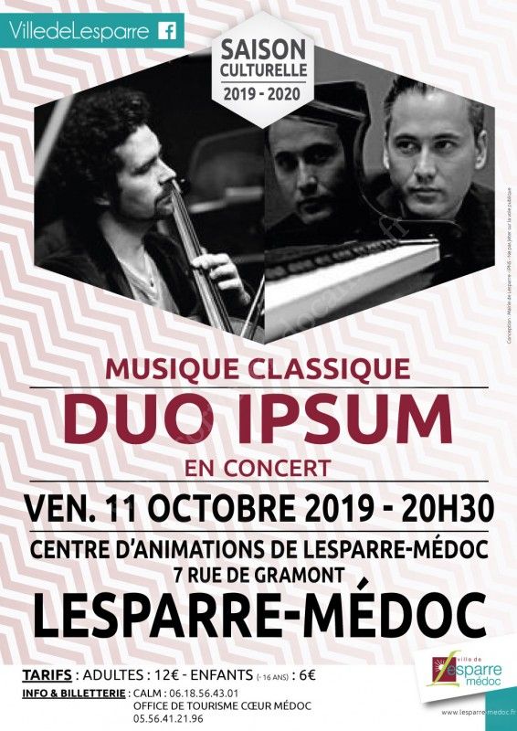 Dans le cadre de sa saison culturelle 2019-2020 sur le thème de l’Allemagne, le Service Culturel de la Mairie de Lesparre-Médoc vous invite à un duo violoncelle/piano par le « Duo Ipsum ».
