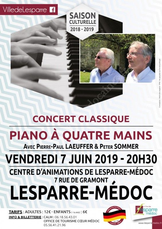 Dans le cadre de sa saison culturelle 2018-2019 sur le thème de l’Allemagne, le Service Culturel de la Mairie de Lesparre-Médoc vous invite à un récital de piano à 4 mains offert par Pierre-Paul Laeuffer (France) & Peter Sommer (Allemagne).