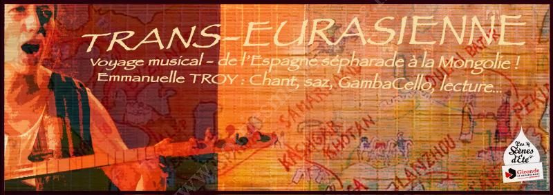 A voix nue, la chanteuse et multi-instrumentiste Emmanuelle Troy (créatrice entre autres du ciné-spectacle "Carnet(s) de Chine") vous entraîne à sa suite dans un voyage insolite et envoûtant, sur les routes du continent Eurasien : depuis l’Espagne sépharade jusqu’à la Mongolie, en passant par l’Occitanie, la Grèce, la Turquie, l’Iran, l’Ouzbékistan, le Turkestan, le Tibet…