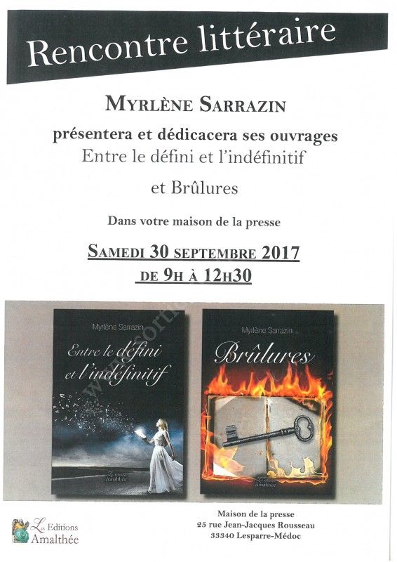 Séance de dédicace de Myrlène Sarrazin pour ses ouvrages "Entre le défini et l'indéfinitif" et "Brûlures".