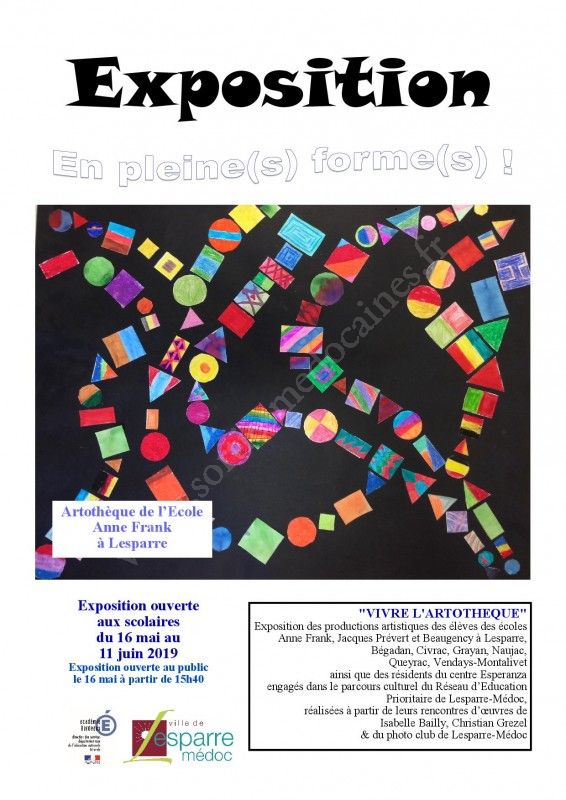 Exposition des productions artistiques des élèves des écoles Anne Frank, Jacques Prévert et Beaugency à Lesparre, Bégadan, Civrac, Grayan, Naujac, Queyrac, Vendays-Montalivet ainsi que des résidents du centre Esperanza engagés dans le parcours culturel du Réseau d'Education Prioritaire de Lespane-Médoc, réalisées à partir de leurs rencontres d'œuvres de Isabelle Bailly, Christian Grezel & du photo club de Lesparre-Médoc.