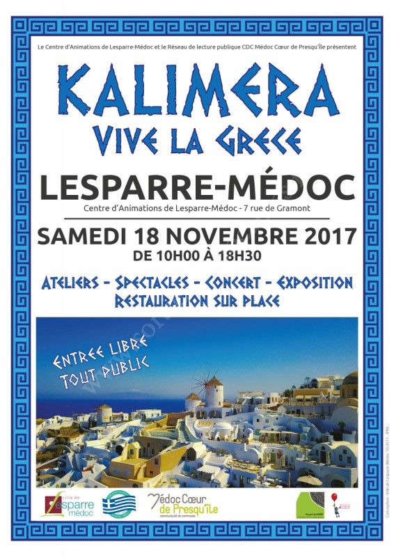 Dans le cadre de sa saison culturelle 2017-2018 (dont le thème est la Grèce), le Centre d’Animations de Lesparre-Médoc et le Réseau de lecture publique Médoc Cœur de Presqu’Île vous invitent le Samedi 18 novembre 2017 au CALM pour la journée :