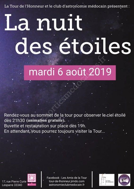 Venez découvrir mardi 6 août 2019 la première édition de la Nuit des étoiles à la Tour de l’Honneur (Lesparre-Médoc).