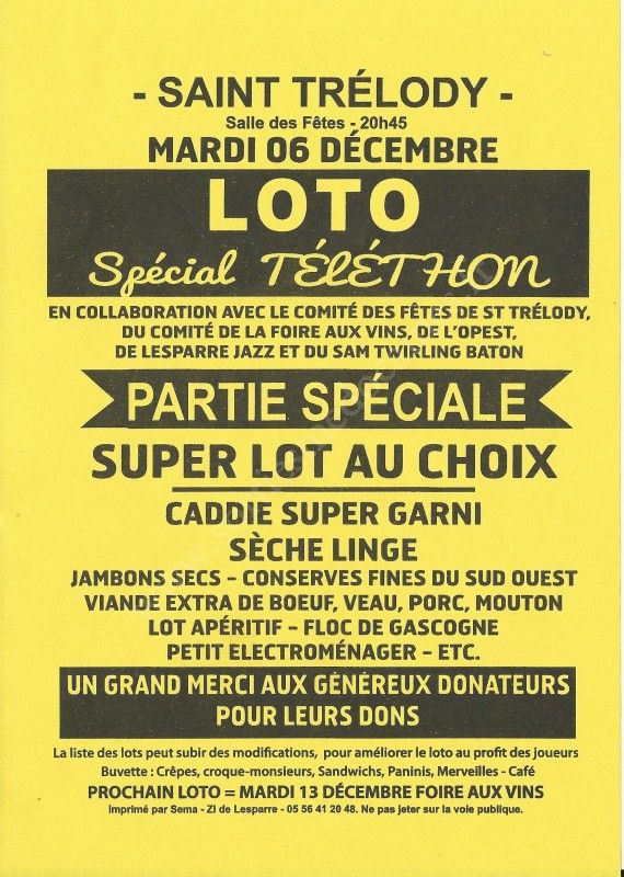 Loto Spécial Téléthon organisé en collaboration avec le Comité des Fêtes de Saint-Trélody, du Comité de la Foire aux Vins, de l'OPEST, de Lesparre Jazz et du SAM Twirling Bâton.