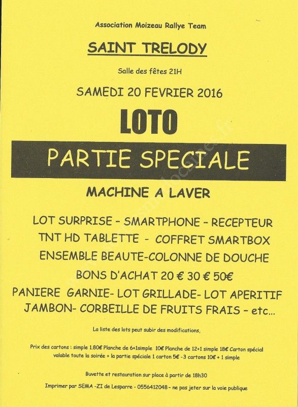 - Lieu : Salle des Fêtes de Saint-Trélody