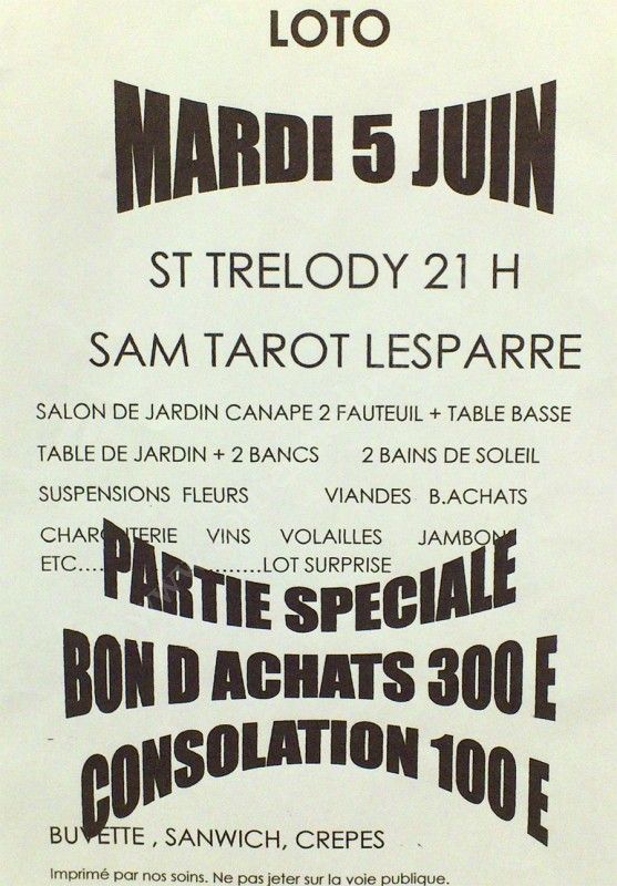 - Lieu : Salle des fêtes de St-Trélody